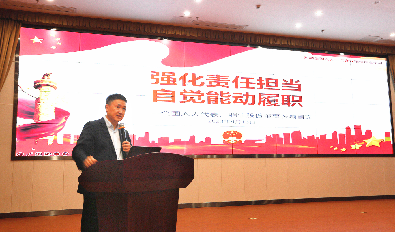 4月13日下午,全國(guó)人大代表、湘佳股份董事長(zhǎng)喻自文在湘佳全產(chǎn)業(yè)鏈學(xué)院為石門(mén)縣部分人大代表宣講全國(guó)兩會(huì)精神。